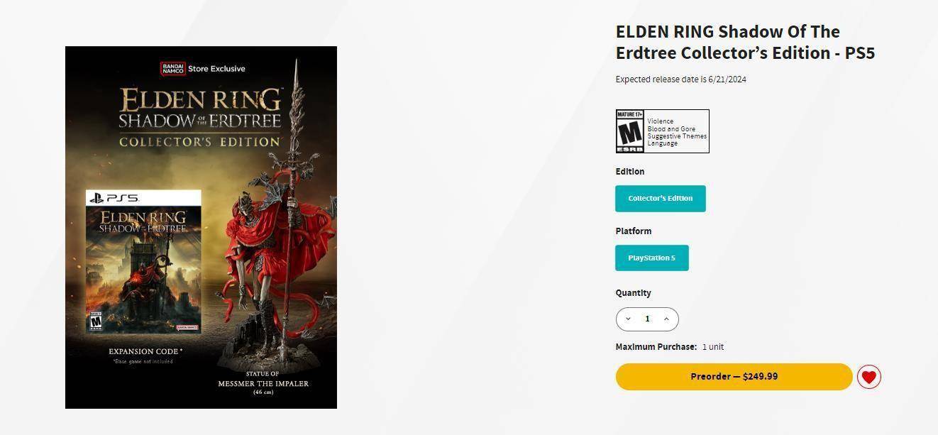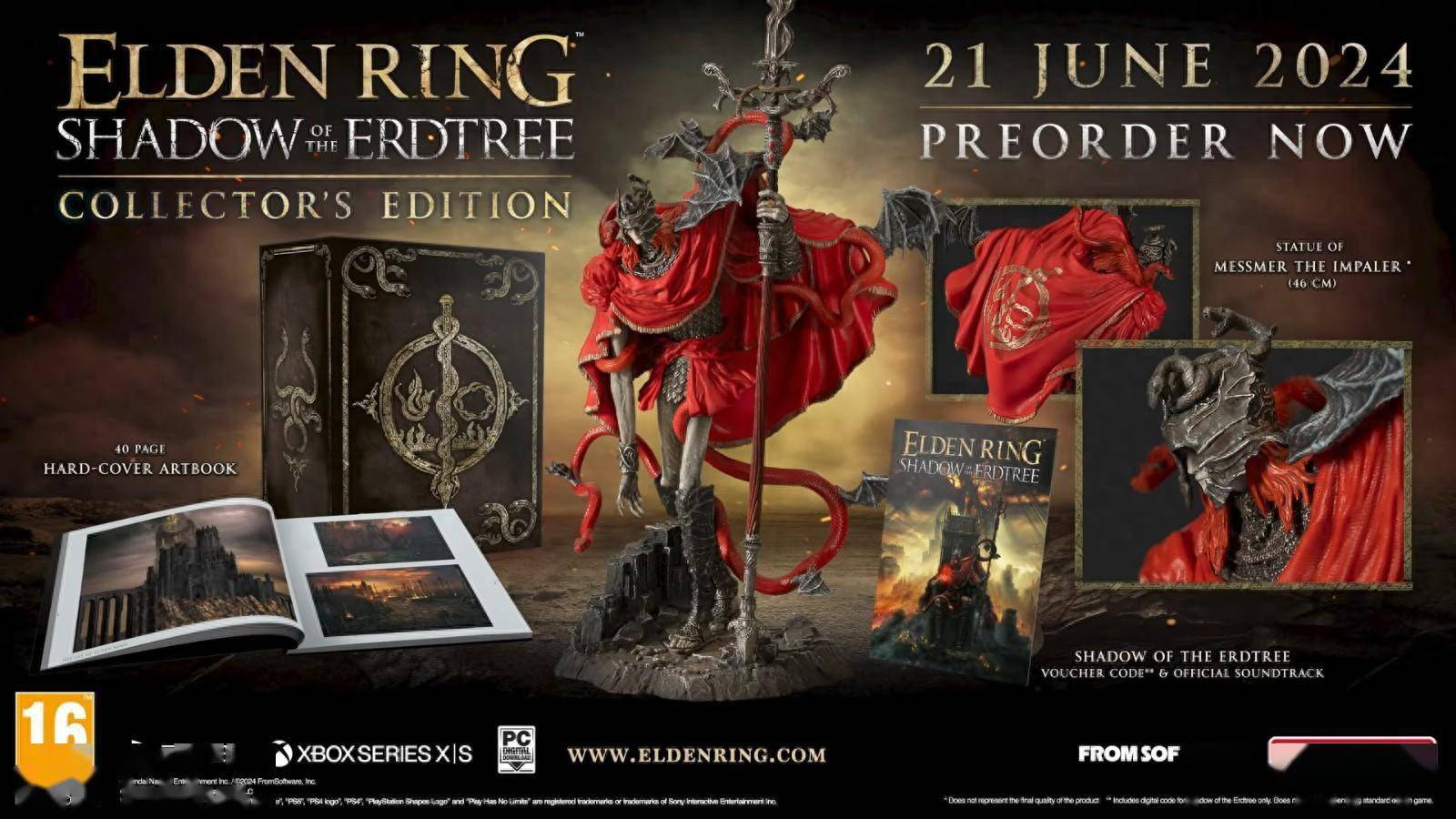 万代南梦宫公布了《艾尔登法环》DLC“黄金树之影”实体典藏版的详细信息,该版本适用于PS5、Xbox Series X|S和Steam,内容包含:DLC“黄金树之影”兑换码(不含本体)、实体艺术设定集(40页)、数字原声带、一尊46厘米的穿刺者“梅瑟莫”雕像,预购奖励为“米凯拉戒指奖励手势”,售价249.99美元(约合人民币1797元),6月21日发售,与DLC同步,数量有限,售完即止。