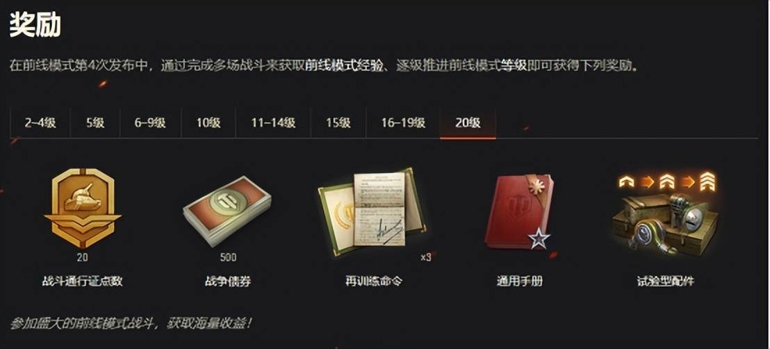 前线模式是《坦克世界》中的一种限时开启的战斗玩法,对于玩标准模式玩到吐的玩家来说,偶尔体验一下不一样的战斗玩法是很有必要的,更何况还能够得到不错的奖励物品呢,包括4个1级橙色试验型配件、再训练命令、1000战争债券等在内的珍贵物品,只需要不断参与前线模式战斗,获取经验推进前线模式等级即可(全部一共20级)。