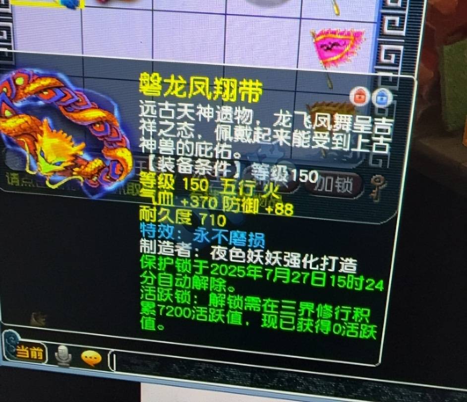 【晚芳亭】一小伙伴联系小生,他的帮派队友在鉴定150级装备时一发入魂,拿到了属性颇高的不磨腰带。