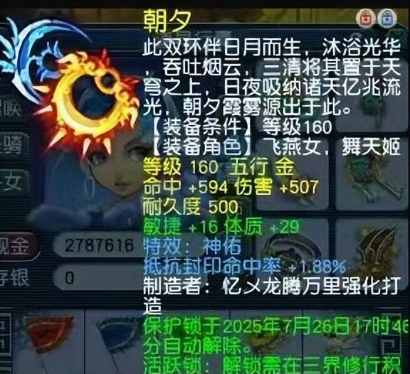 昨日下午,有位少侠在鉴定160级武器的过程中,喜提了初始伤害507且敏体双加45的神佑抗封环圈。神佑的效果是被击倒时触发20%几率复活,而抗封蓝字就是提升自身抗封几率,两者合一比较适用于普陀、天机等辅助门派。