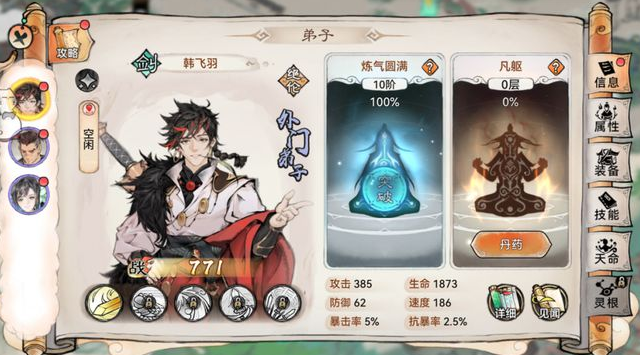 韩飞羽的初始属性在弟子群中并不算特别出众,因此玩家若想使韩飞羽发挥最大输出,需要提高他的潜力。为达到此目的,我们需为韩飞羽佩戴能增加潜力的玉符,以确保他的实力不落下风。此外,在每次战斗前,可以让韩飞羽在坊市中品尝美酒,这样将大大提升他所造成的伤害。