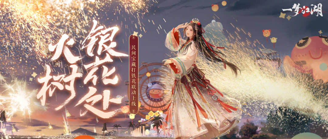 而到了确山铁花,这一国家级非物质文化遗产的引入,更是体现了糊糊对传统文化的敬重与传承。确山铁花作为一种古老而独特的民间表演艺术,通过《一梦江湖》的呈现,让更多的少侠们有机会近距离欣赏到这一震撼人心的表演。通过高温铁汁的击打,形成高达十几米的铁花,当炽热的铁水被高高抛起,它化作漫天繁星般的雨滴,闪烁着璀璨的光芒,这正是华夏民族所独有的魅力所在,浪漫值拉满!游戏中,铁花在夜空中绽放,犹如银色的花朵,小编也想亲自尝试一下打铁花了!
