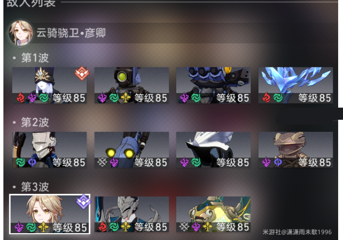 上路敌人并无过多注意事项。第1波次中蚕食者之影的禁锢、第3波次中彦卿的冰冻需要及时解除,以免被拖延过多时间;第3波次中,以扩散战技为主要输出手段的卡芙卡和黑天鹅,可能难以同时清理掉分布于彦卿两侧的三只小怪,可考虑携带充能绳,通过更多群攻终结技消灭小怪。