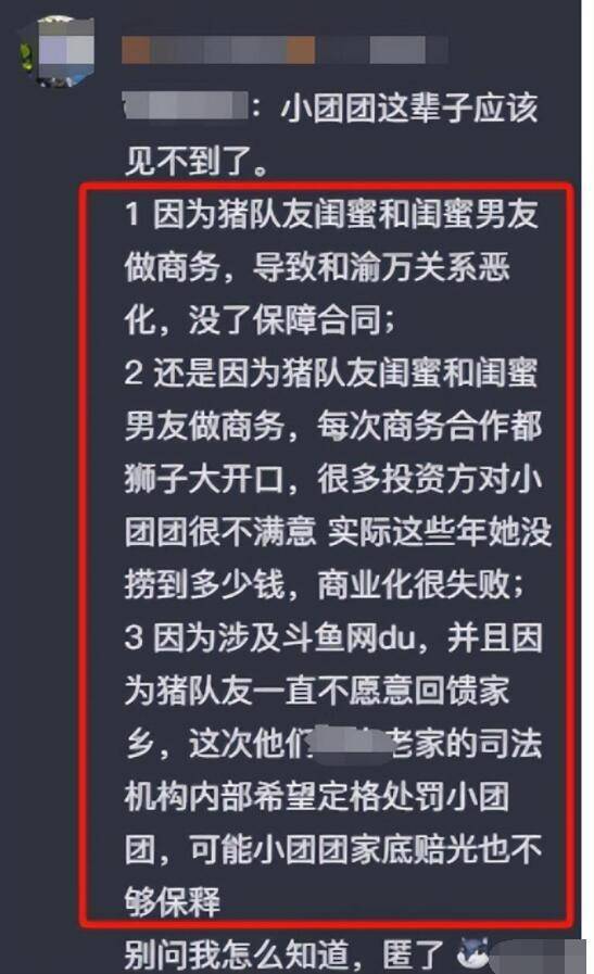 根据爆料,小团团因为猪队友闺蜜和闺蜜男友做商务,导致和YW(渝万公会)关系恶化,没了保障合同,每次签约都狮子大开口,所以其实她这几年没有捞到多少钱,所以这次被顶格处罚后,小团团根本没多少钱。