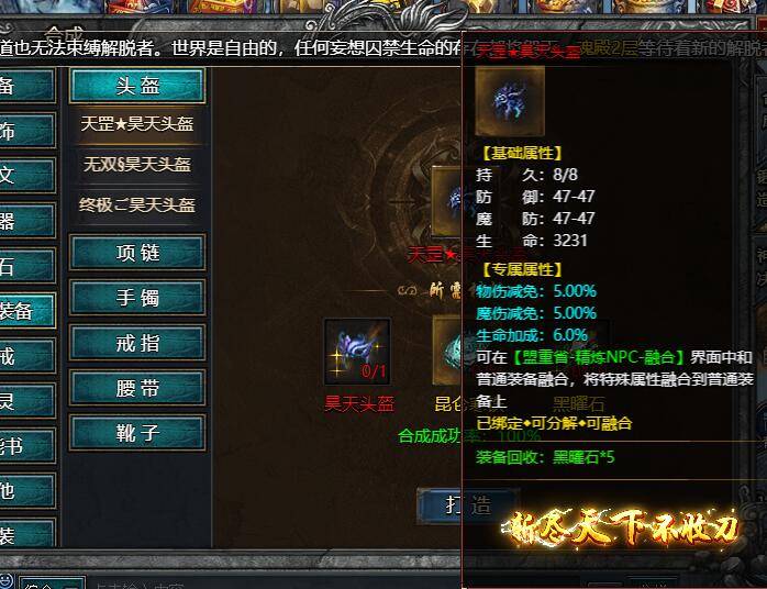 大家要想融合昊天装备,可前往盟重省的精炼NPC“融合”处,即可进行装备的融合,将昊天装备的特殊属性融合到普通装备上,让你变得更强哦。