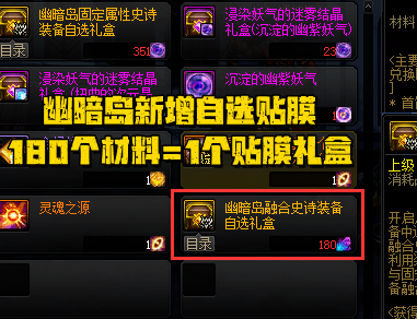 为了让玩家更容易获得贴膜材料,幽暗岛新增了贴膜保底机制。玩家可以用新材料“幽火紫痕”兑换幽暗岛贴膜礼盒,即使是非酋玩家也可以通过积累材料慢慢毕业。根据难度不同,玩家每周可以获得不同数量的材料,最快4周就可以兑换到一件贴膜。