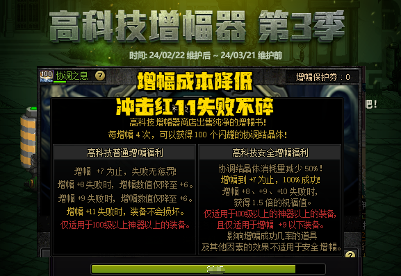 这意味着在增幅活动期间内,增幅价格比常规时候要便宜,一件红10的期望价格在2000万左右。此外,红11失败不碎的设计也相当于给每一件红10装备上了一张增幅保护券,鼓励玩家冲击更高层次的增幅。