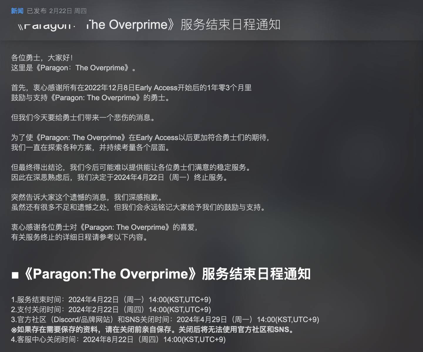 IT之家 2 月 23 日消息,Epic Games 在 2016 年推出了 MOBA 网游《虚幻争霸》,本作在 2018 年宣布停止开发,此后开发商 Netmarble 接盘游戏 IP,在 2022 年 12 月推出了“精神续作”《虚幻争霸:过载(Paragon:The Overprime)》,不过这款游戏目前也将面临停服的命运。
