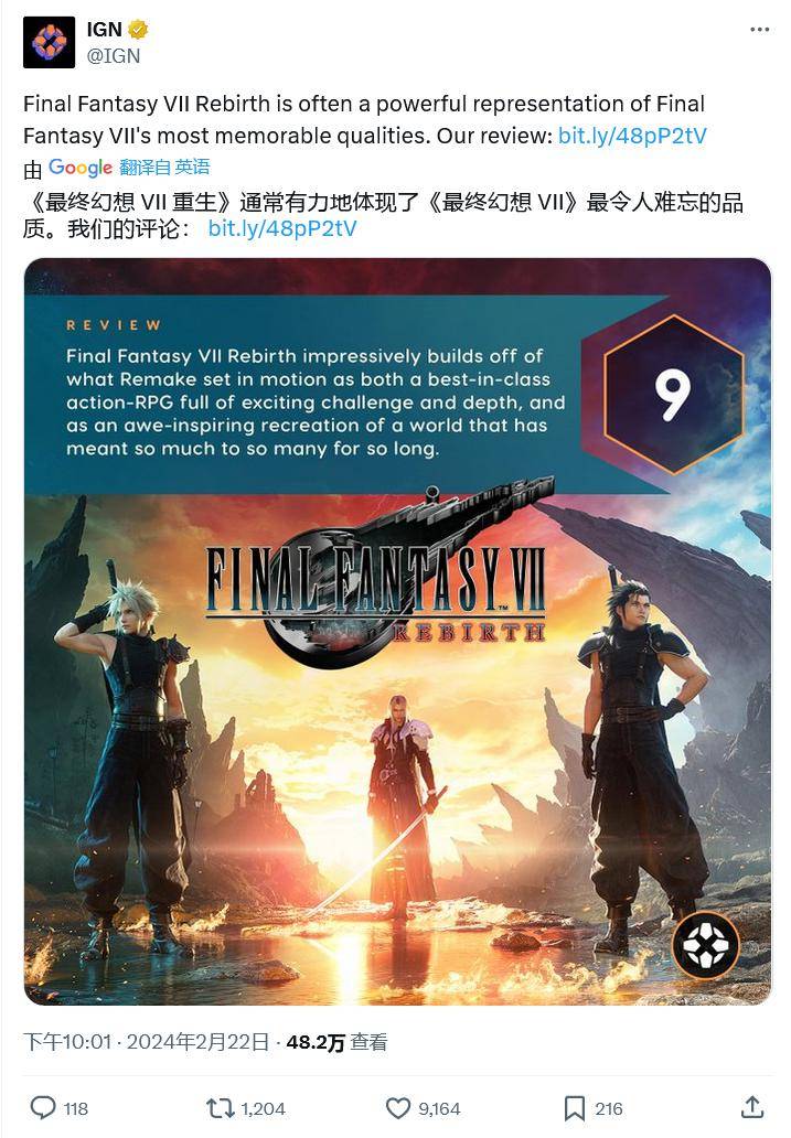 IT之家 2 月 23 日消息,《最终幻想 VII:重生》游戏媒体评论解禁,整体而言的评价是正面的,IGN 评分为 9 分,Metacritic 网站评分 93%,OpenCritic 网站评分 93%(推荐率为 100%)。