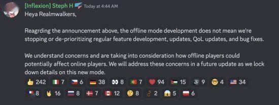 由于不少玩家是独自进行游戏并不存在联机情况,如仍需全程网络在线,难免会因为网络波动或网速问题影响游玩体验。有鉴于此,官方已决定开发“离线模式”,待到该模式上线,玩家便可以在断网情况下进行单人游玩,不再受网络条件约束。