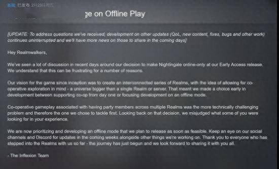 “回顾这个决定(全程网络在线),我们意识到可能没有准确把握到部分玩家在正常游戏体验中最期待的内容,我们深感歉意。”在公告中,官方展现出了相当的诚意。