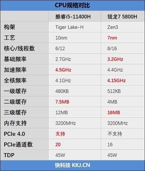但是三级缓存i5-11400H是12MB,而锐龙7 5800H是16MB,后者略有优势。