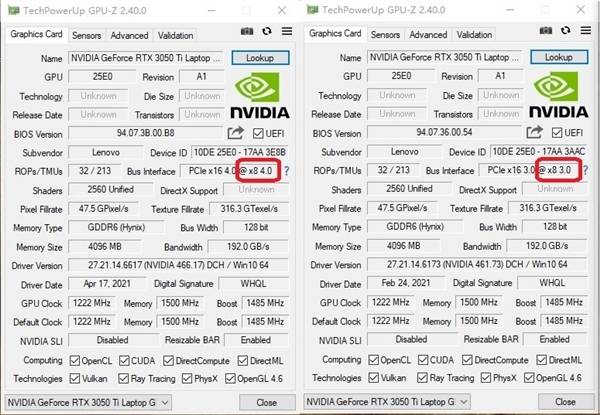 左边是拯救者Y7000P,右边是拯救者R7000P,可以看到2款笔记本所搭载的RTX 3050 Ti在参数方面基本上一样,唯一的差别就是拯救者Y7000P是PCIe 4.0 x8,而R7000P是PCIe 3.0 x8。