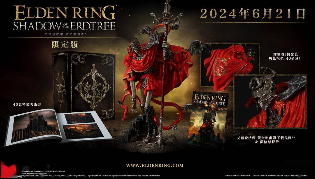《艾尔登法环 黄金树幽影》限定版也将于6月21日推出,包含限定外盒、40页美术书、穿刺者梅瑟莫角色模型(46厘米高)、艾尔登法环黄金树幽影下载码、数位原声带。