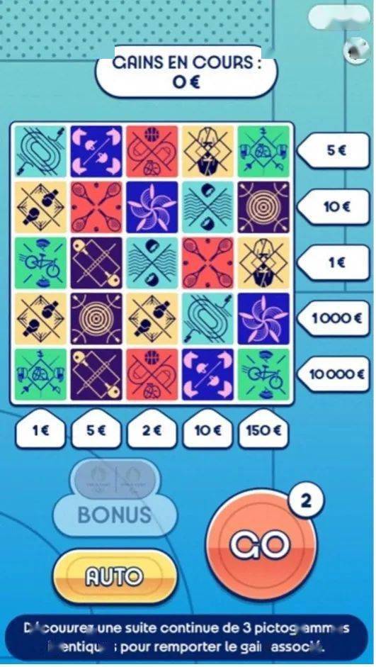 “2024巴黎之路”游戏的玩法非常简单,购彩者有3次机会,每次单击“Go”或“Auto”按钮,屏幕上的游戏图案就会翻转,如果在一行水平线或一列垂直线上有任意3个完全一样的图案,则可中得相应的奖金。为了提高游戏的趣味性和中奖率,这款游戏还设计了许多“花牌”,例如,出现“+1”或“+2”符号,表示购彩者有1次或2次额外的游戏机会;出现“吉祥物”符号会使位于同一水平线上的所有图案消失,并被新的图案所取代;出现“奖牌”符号意味着购彩者可以直接中得奖牌上注明的金额;出现2024年巴黎奥运会等官方标志符号意味着购彩者找到了“隐藏游戏”, “隐藏游戏”的玩法是点击6个图案,如果翻开后有2个一样的图案,则中得相应奖金。