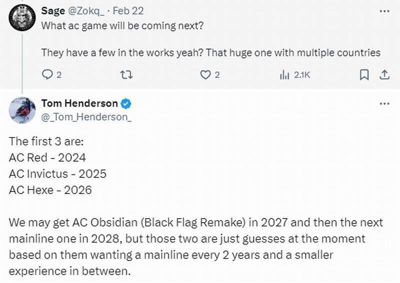 Tom Henderson猜测育碧可能将在2027年推出《刺客信条:黑曜石》(黑旗重制版),在2028年推出《刺客信条》系列下一款正传游戏。当然这两个年份只是猜测,因为育碧希望每两年推出一款正传游戏,并在两者之间补充小体量的作品。