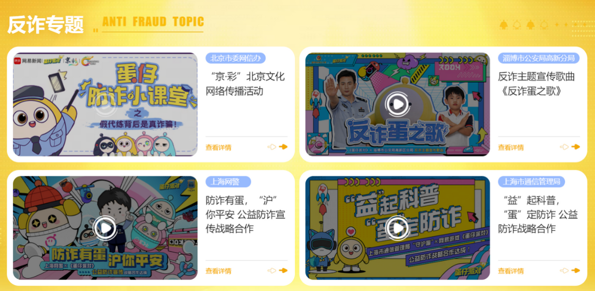 在这个互联网越来越发达的时代,也不断发生例如网络诈骗、网络暴力等等不安全、不健康的现象,而心智尚未成熟的未成年人则更容易被受到影响。《蛋仔派对》携手权威机关,共同构筑网络安全防线,全力保护未成年人的游戏安全,从防诈到防沉迷都做出的相对应的举措。例如《蛋仔派对》与上海网警、杭州市公安局、北京市网信办等权威机构携手,进行深度的防诈宣传合作,从多元媒介、IP联动到线上下联动,无死角守护未成年人网络安全。