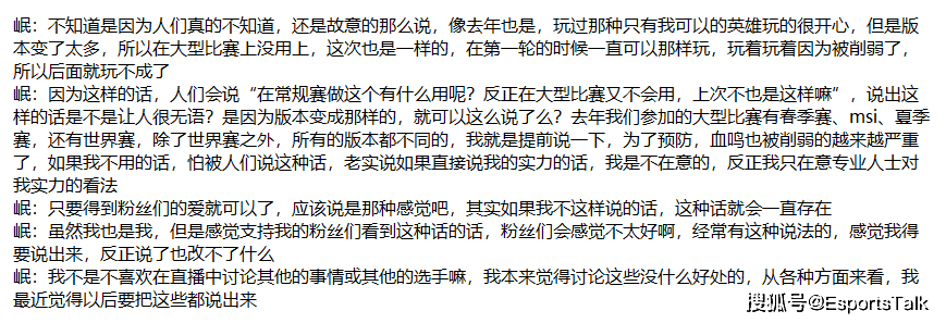 keria这段话有点打预防针的味道,他的大概意思就是说,因为版本变化太大,所以才导致了之前选的非常规辅助,最后没有用。而最近因为LCK启用了14.3版本,血鸣的削弱也加剧了这些英雄将无法再次登场。此外他还多次提到了粉丝,他表示对于外界质疑自己的实力并不在意,因为自己也只在乎专业人士的看法,但粉丝看到这种话感觉会不太好,所以这次有必要站出来回应一下。