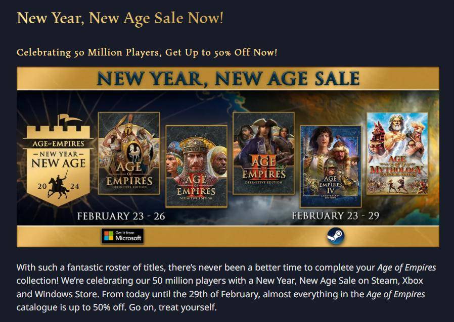 · 为庆祝《帝国时代》系列迈向新年新时代,系列作品以及DLC开启促销,几乎全部5折,截止至2月29日。另外,《帝国时代III:最终版》开启实现免费游玩。