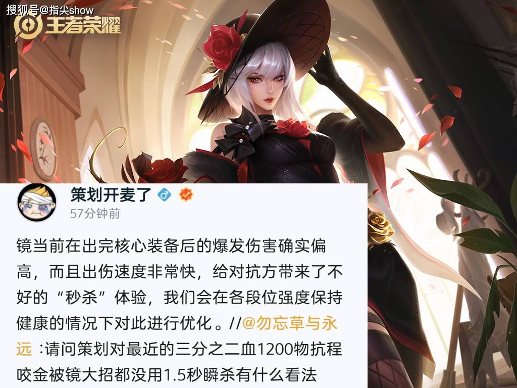 有人问,对最近三分之二血1200物抗的程咬金被镜秒杀,还没用大招的事情怎么看?策划做出的回应,对镜目前的爆发伤害太高做出了肯定的答复。