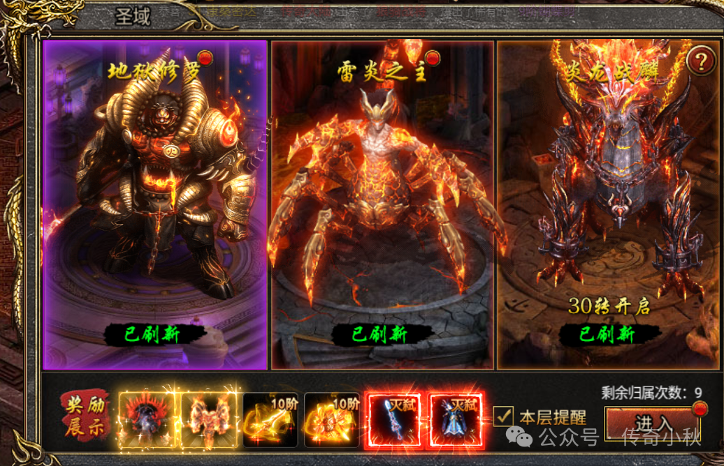 圣域第 30天开启,开启后玩家可选择区域进入击杀圣域BOSS。2、圣域内的圣域BOSS与魂域内的魂域BOSS次数共享,即每天3次BOSS归属次数,晚上 24点刷新。当天未用完的归属次数,次日可叠加,最多可累积9次!