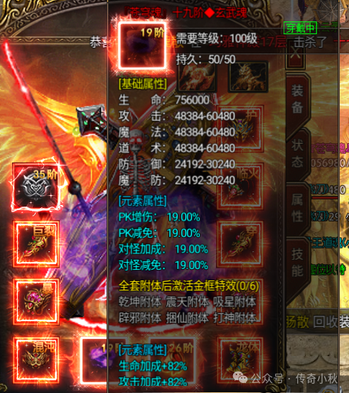 苍穹魂不仅外观炫酷还能提供大量属性,首先就有6维基础属性加成,然后是百分比pk、对怪增伤减伤,最后还有6维属性的百分比加成,加成多少根据苍穹魂等级也会有提升。