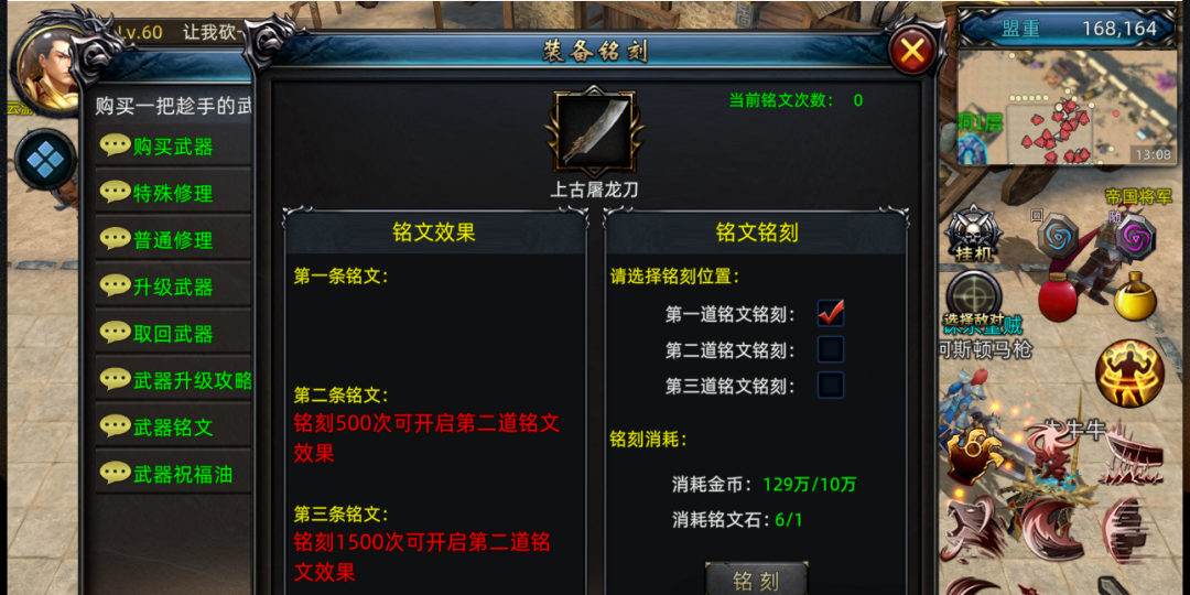 3、铭文系统无法。铭文玩法是传奇3D手游一大特色,有武器铭文铭刻和技能铭文铭刻。武器铭文铭刻需要前往武器店老板进行,需要相应铭文及金币,武器铭刻有三条铭文,第二条铭文需要铭文次数达到500次开启,第三条铭文则需要1500次。技能铭刻需要消耗相应技能书及铭文开启孔洞,然后才可镶嵌铭文