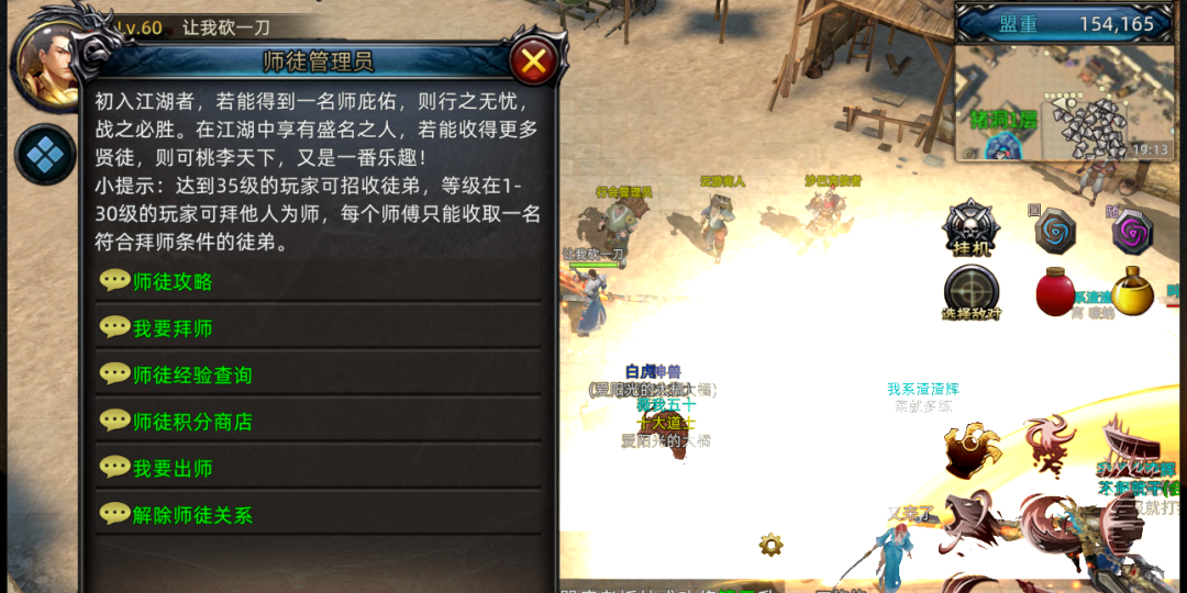 1、师徒系统玩法。游戏内达到35级的玩家可招收徒弟,等级为1-30级的玩家可拜塔人为师,每个师傅仅可招收一名玩家为徒弟。师徒可通过完成任务获取师徒积分,积分可换取经验、金币、药水等道具。