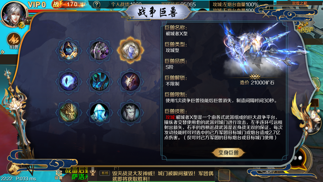 每次发动技能时,它都能对选中的己方军团目标城门或炮台造成惊人的2.7亿点伤害。该技能只能对己方军团的目标炮台或目标城门使用,且巨兽在使用1次技能后就会消失,制造间隔时间为30秒。
