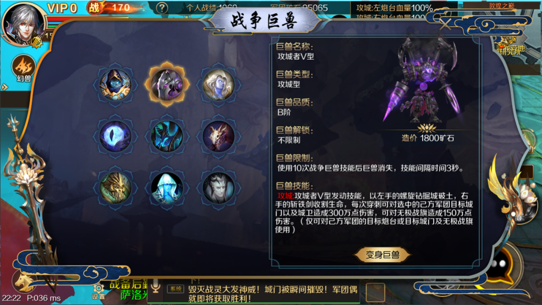 同样是B级品质的攻城者V型,其解锁条件同样无限制。它拥有更为强大的“毁灭穿刺”技能,以左手的螺旋钻掘城破土,右手的斩铁剑收割生命,每次穿刺可对选中的己方军团目标城门以及城卫造成高达300万点伤害,对无极战旗也能造成150万点伤害。但请注意,该技能同样只能对己方军团的目标炮台、城门及无极战旗使用,且巨兽在使用10次技能后会消失,技能间隔时间为3秒。