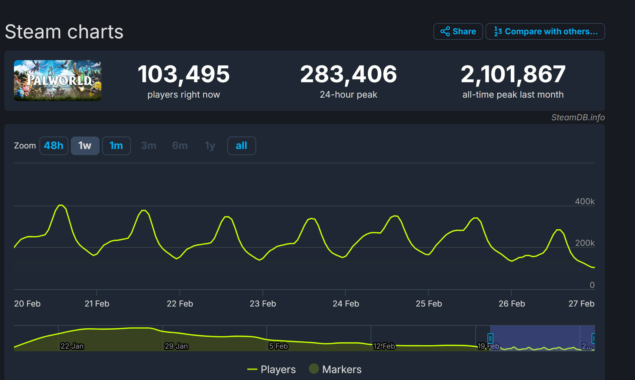 然而,《幻兽帕鲁》的辉煌似乎并未持续太久。据SteamDB数据显示,仅仅发售一个月后,这款游戏就流失了高达84%的玩家。目前在线人数约为10万,24小时峰值也仅为28.3万。与巅峰时期的在线人数相比,这款游戏似乎已经失去了往日的辉煌。