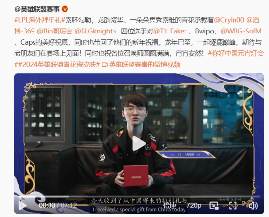 也正是有着越来越多像《英雄联盟》这样的游戏,不断地向全世界输出着中国文化的魅力,可以发现近年来,越来越多的海外玩家对中国传统文化有了新的认识。比如在中国日报“你好!中国”元宵灯会全球24小时直播活动上,《英雄联盟》官方带领下一起探寻青花瓷文化的艺术魅力,更有着Cryin00、369、Bin哥、BLGknight,和Faker、Bwipo、WBG-SofM、Caps四对知名选手相互赠礼互动拜年,赠送青花瓷礼品。