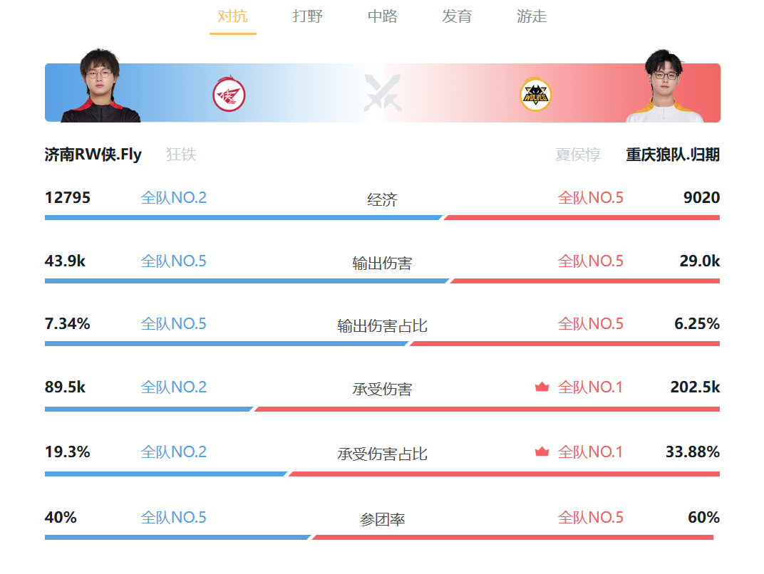 从数据雷达对比可以看出,RW五个人的表现都不是太好,包括Fly。值得一提的是妖刀,他的生存能力一流,主持人都在夸赞他,一局游戏下没有出任何错误。由此可见,妖刀很珍惜来之不易的首发,他特别想留在战场上。Fly的数据远不如归期,但Fly每死承伤数据拉满,这说明Fly是在负重前行,比赛虽然输了,但他也尽力了。