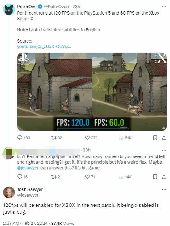 据推主PeterOvo报道,《Pentiment》在PS5上的帧率为120fps,而在XSX上仅为60fps。Josh Sawyer随后发文回应称,在Xbox上禁用了120fps只是个bug,并向玩家保证在下一个补丁中将为Xbox启用120fps。