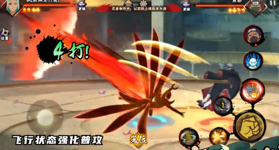 地面一技能后摇阶段点击二技能, 会在喷出鳞粉后衔接一个远程的翅斩波,接着朝着前方冲刺攻击,最后进入到飞行状态。空中一技能加二技能,同样也是在鳞粉后衔接攻击,但会变成一个尾兽化抓取的效果。所以,这个忍者虽然有抓取技能,但门槛比较高,你必须要先借助二技能升空,然后再一技能加二技能释放组合技才行。最后就是新佩恩六道系列忍者通用奥义尾兽玉,地面释放会先飞起来然后追加后续的攻击,如果在空中释放的话就省略了起飞的过程,直接打出后面的效果。