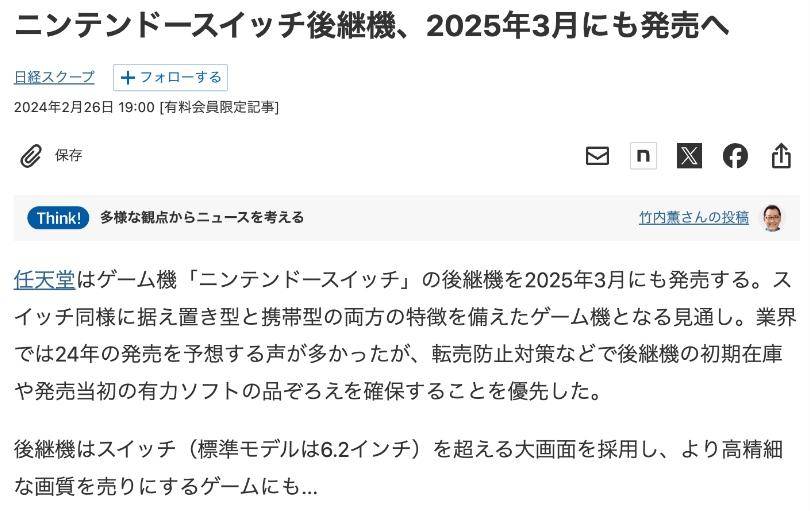 这是源自日经新闻的一份报道,指出任天堂计划于2025年3月推出新主机,比之前的传闻时间晚。报告进一步透露,任天堂已经将Switch 2的初始销售列为首要任务,并给予游戏开发人员更多时间来创作备受玩家期待与欢迎的第一方游戏。