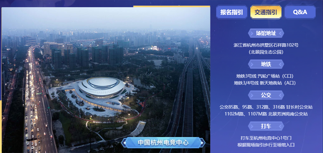 打车:打车至杭州电竞中心1号门,根据现场指引至场馆入口。