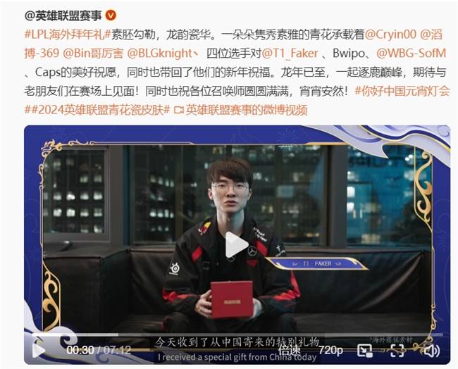 其实,青花瓷作为中国传统文化的瑰宝之一,曾经通过海上丝绸之路走向世界。如今,《英雄联盟》以游戏为媒介,再次以多元化的方式将这一文化符号带入全球玩家的视野。比如今年中国日报“你好!中国”元宵灯会全球24小时直播活动,《英雄联盟》官方携手全球电竞运动员们,送上了新春大拜年。Cryin00、369、Bin哥、BLGknight,和Faker、Bwipo、WBG-SofM、Caps四对知名选手更是相互赠礼互动拜年,赠送青花瓷礼品,又让不少海外玩家对中国传统文化有了更深的认识。
