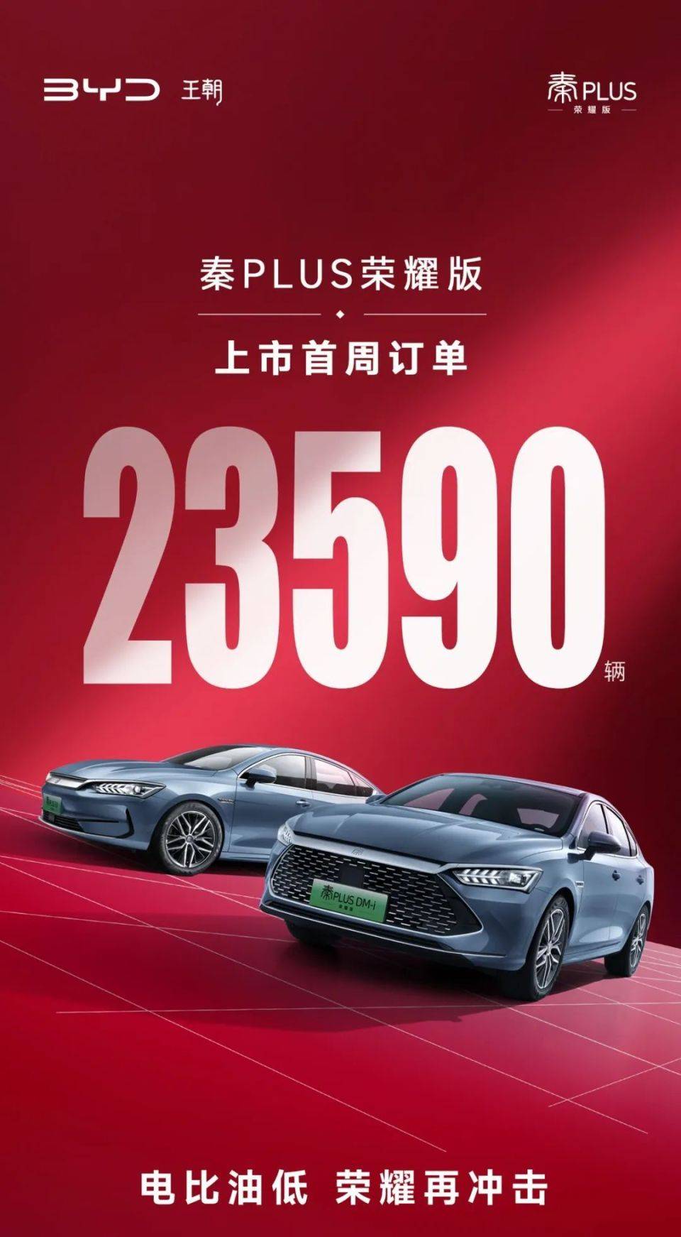 2024年2月26日,比亚迪官方发布了秦PLUS DM-i荣耀版上市首周的订单成绩:单周订单23590辆!这一成绩,比整个比亚迪秦系列1月的单月销量(21767辆,包含秦EV)还要高。