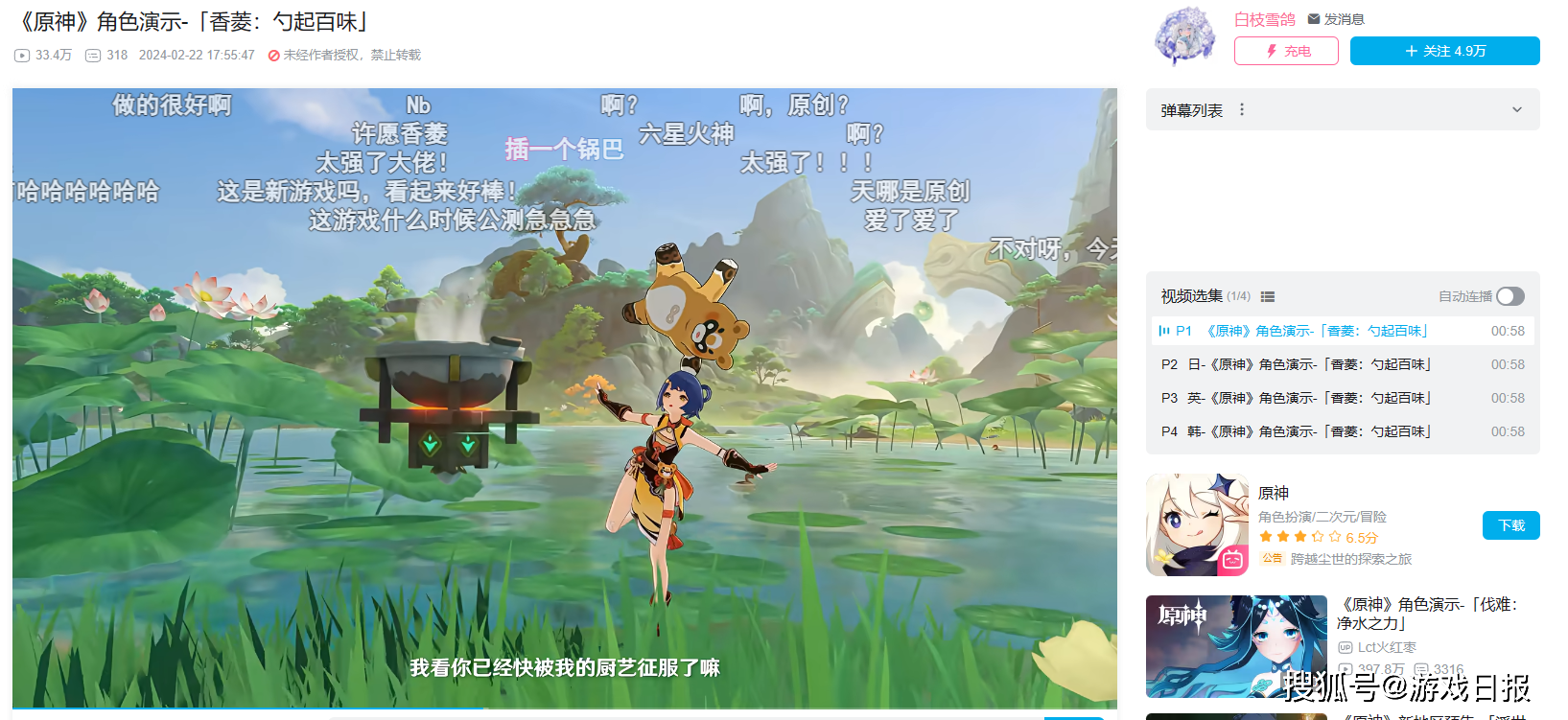这原本对于香菱厨来说,是有点小遗憾的。但原神玩家是什么人?既然官方没有发布香菱的角色演示,那玩家们就决定自制。于是在寻味之旅第七期上线之前,UP主“白枝雪鸽”为香菱做了一个名为“勺起百味”的角色演示。