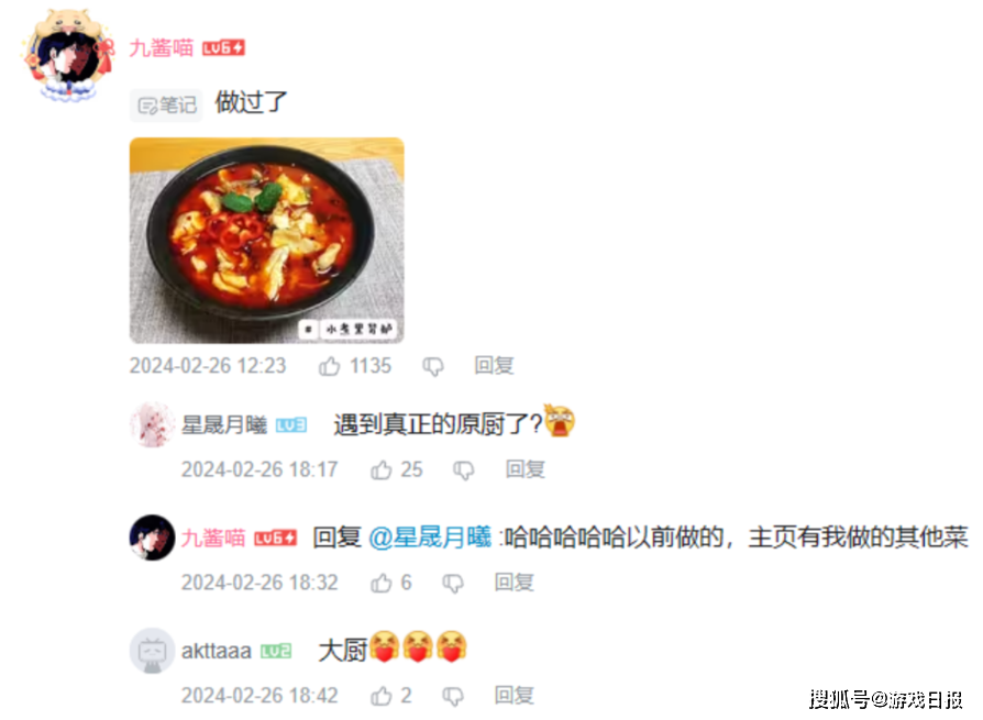 不过,水煮鱼作为我国经典菜品,不仅只有大厨会做,咱们很多国内的原神玩家也都是高手中的高手。因此,在本次寻味之旅的评论区里,也有很多玩家晒出了自己的成品,获得了大家的点赞。比如这位叫做“九酱喵”的大佬复刻的这道“水煮黑背鲈”,就看的玩家直呼大厨。