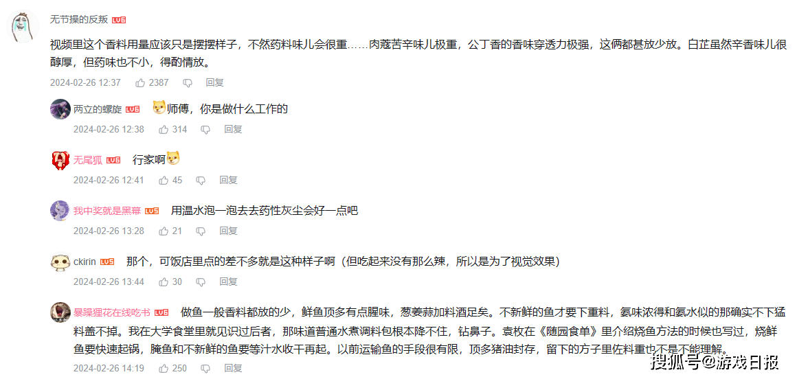除了有放图证明自己实力的,也有真正的大厨在评论区对本期的菜品做点评。比如这位ID为“无节操的反叛”的网友,就指出了视频里的香料用料应该只是摆摆样子。否则这条鱼的药料味会很重。看得出来,原神玩家们对于食物真的很严格,即便是官方做出的菜品,只要有不足的地方,就会指出来。