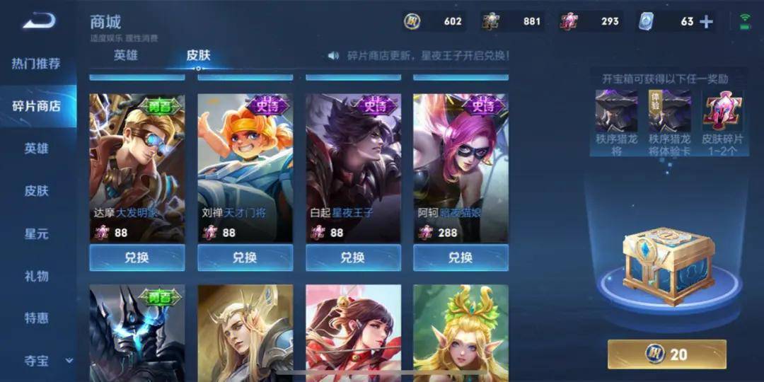 碎片商店终于要更新了,许多玩家在春节期间攒了好些皮肤碎片正等着花出去呢。本次碎片商店更新可以确定的是288史诗会轮换到阿轲的“暗夜猫娘”,普通史诗进入备选名单的有10款,分别是兰陵王的“暗隐猎兽者”、蔡文姬的“舞动绿茵”、宫本武藏的“鬼剑武藏”、刘禅的“绅士熊喵”、白起的“星夜王子”、孙尚香的“水果甜心”、夏侯惇的“乘风破浪”、小乔的缤纷独角兽、刘邦的德古拉伯爵和吕布的圣诞史诗。