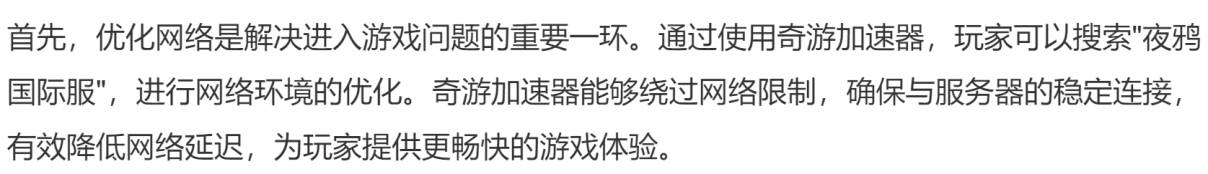 除了以上方法,玩家在遇到问题时也可以检查游戏的更新情况,确保客户端是最新版本。有时候,游戏更新可能包含了修复一些连接和性能问题的内容。总体而言,针对《夜鸦国际服》的进入问题,玩家可以从优化网络、刷新电脑网络、释放运行内存等多个方面入手,以提高游戏的稳定性和流畅度。