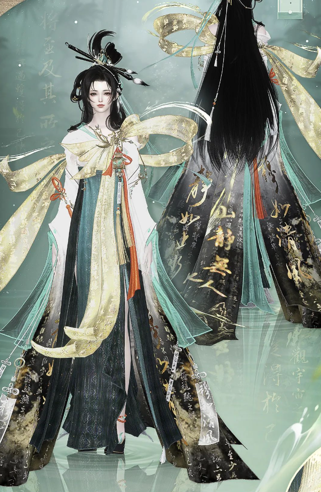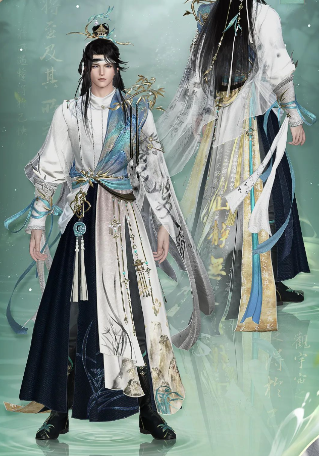 时装上半身同样采用乳白色设计,不过左边袖装的设计非常大胆,通过墨色字迹搭配金色修竹凸显男性角色谦谦君子的气质。而下装采用《兰亭集序》的墨色画风以及玄色下装,让时装整体色彩处于完美的平衡。