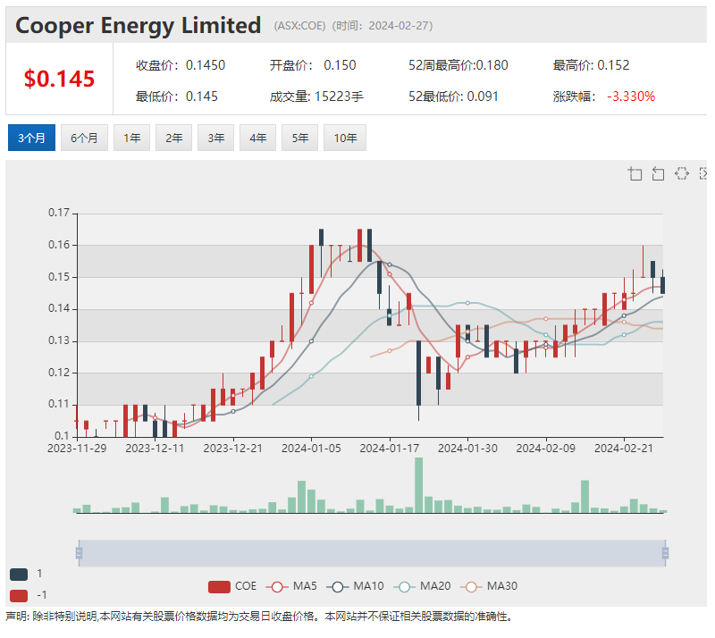 公告发布后,Cooper Energy股价周二午盘表现平稳,12:08成交价为0.15澳元,与昨日收盘价持平。该股近一年的投资回报率为亏损11.76%。
