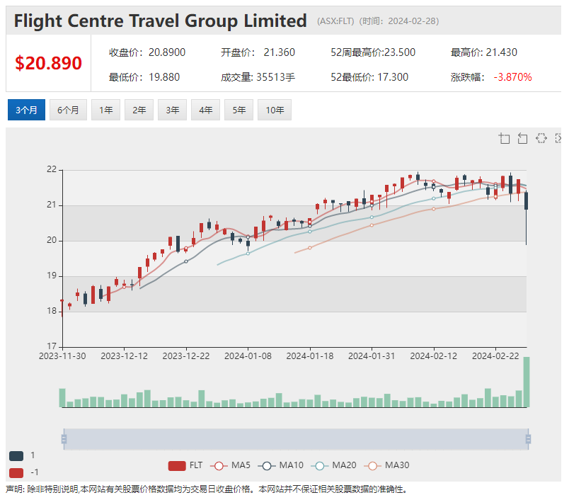 公告发布后,Flight Centre股价周三早盘下跌。11:58成交价为20.09澳元,下跌1.64澳元,跌幅7.55%。该股近一年的投资回报率为6.86%。