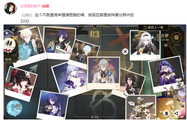 还有网友晒出自己的梦境护照,看得出这位玩家是有点思考在身上的,他把匹诺康尼的角色都按照阵营进行划分,大概是为了方便以后推理的时候理清思路吧!