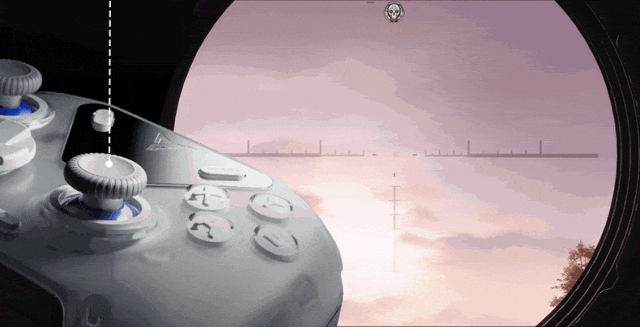 这一设计放弃了传统手柄摇杆的“平面画圆”的二维转动方式,而是重新设计了摇杆的力传动方式。飞智团队发明了一种轮毂式合金轴承结构,极大地减少了转动阻尼,同时通过精确的几何运算与软件排布计算出阻尼一致性的标准值,从而首创了全球第一款飞控级游戏摇杆。