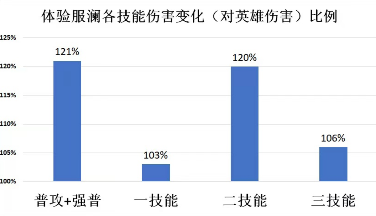 策划调整英雄参考的是数据,游戏体验方面还需要澜玩家去测试。策划放出了体验服和正式服澜调整前后的对比,目前体验服的澜数据上完全强于正式服的澜。其中普攻和强化普攻伤害提升21%,二技能伤害提升20%,一三技能伤害也有3%和6%的涨幅,策划认为澜的调整方向没有问题,澜正在稳定向好。